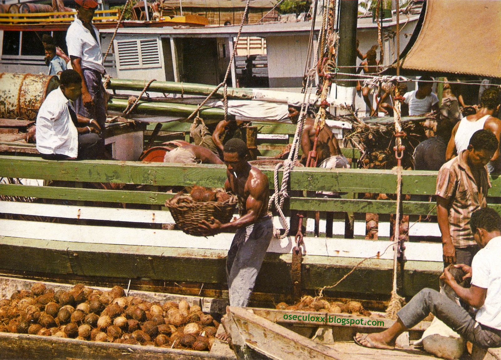 Foto publicada no Atlas Universal 28- Editora CODEX.Cartagena, noroeste da Colômbia. Quase não havia mais lugar para acomodar os cocos [transladados da escuna] na estreita canoa escavada em tronco de árvore. A mercadoria, produto essencial na alimentação das populações subtropicais do país, já tinha destino certo.