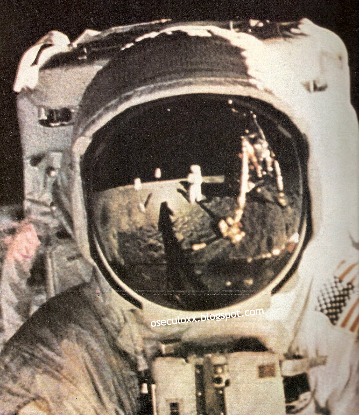 1969, 20 de julho. Como um espelho, o visor do traje espacial de Edwin Aldrin reflete, próximo ao módulo lunar, a presença do astronauta Neil Armstrong na Lua.