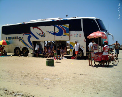 O compartimento de bagagens, aberto pelos dois lados, foi transformado em providencial abrigo contra os raios solares que se tornaram incômodos a partir das 11 horas.